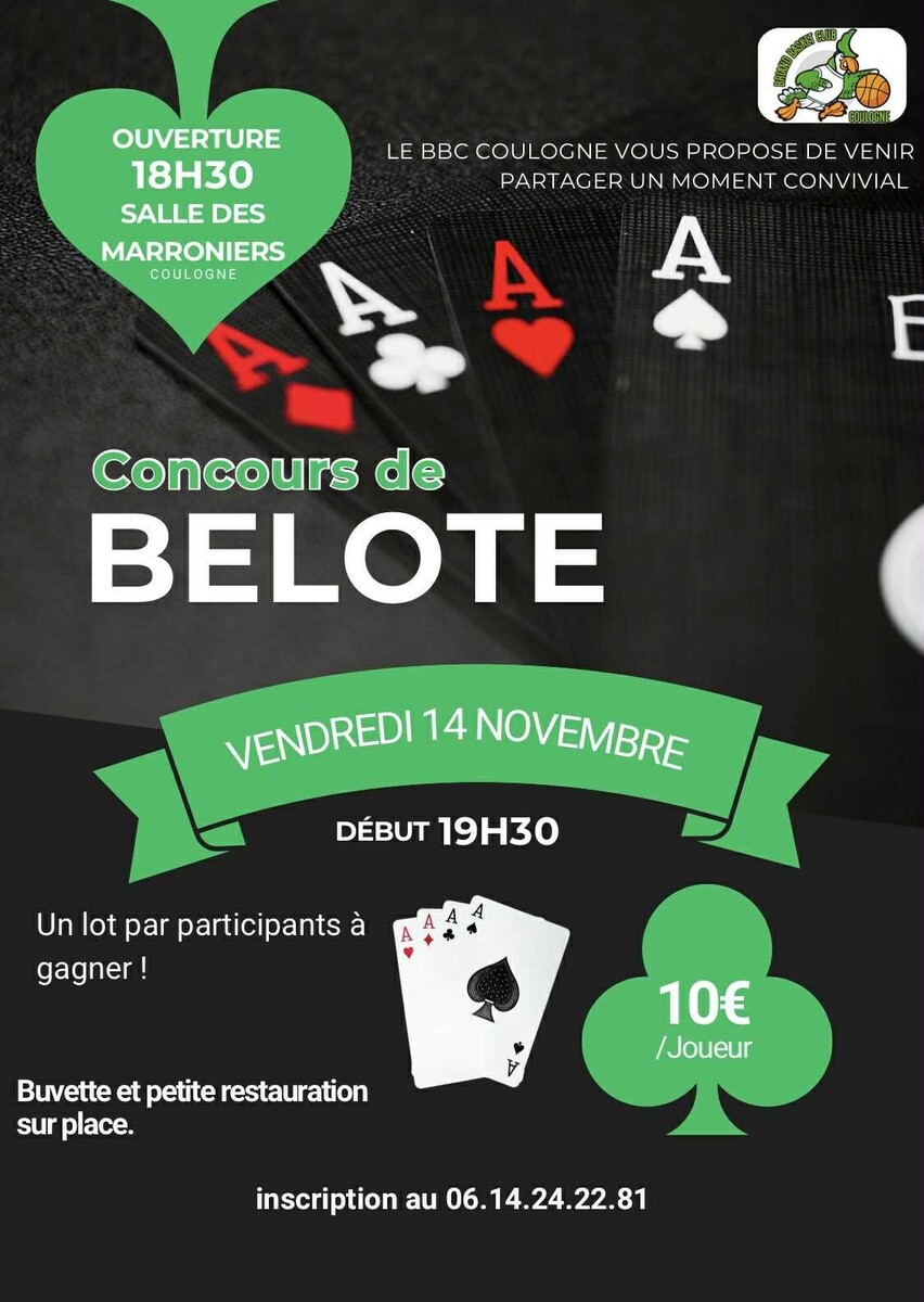 Comme chaque année, le BBC Coulogne organise son traditionnel Concours de BELOTE (4 parties en 1501 points dont une individuelle.