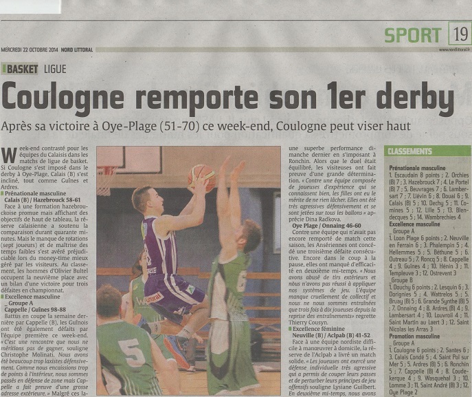 Le quotidien Nord Littoral revient aujourd'hui sur la performance des Seniors A contre Oye Plage la semaine dernière (victoire 51-70). L'article complet est à lire ce mardi 22 octobre en page 19.