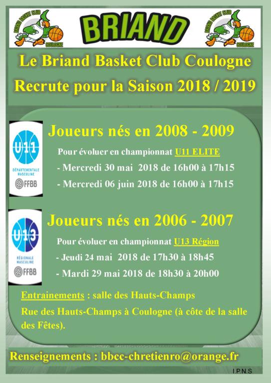 Pour la saison 2018-2019, le BBC Coulogne organise des détections pour les U11 Elite et U13 Région.