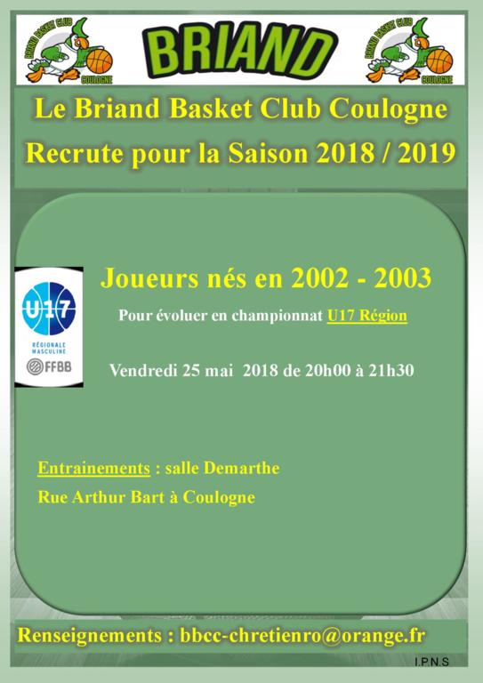 Pour la saison 2018-2019, le BBC Coulogne organise des détections pour les U17 Région.