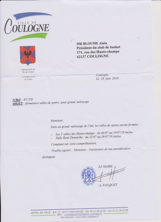 La salle des hauts champs sera fermée du 08/07/2019 au 19/07/2019 inclus. La salle René Demarthe sera fermée du 22/07/2019 au 26/07/2019 inclus. Les deux salles sont fermées pour nettoyage. Alain